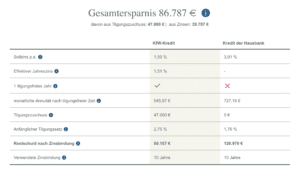 Pro Wohneinheit ist ein Kredit von 150.000,- denkbar. Im Vergleich mit einem normalen Bankkredit könnte inkl. einem Tilgungszuschuss von 47.000,- EUR folgender Vorteil daraus resultieren: